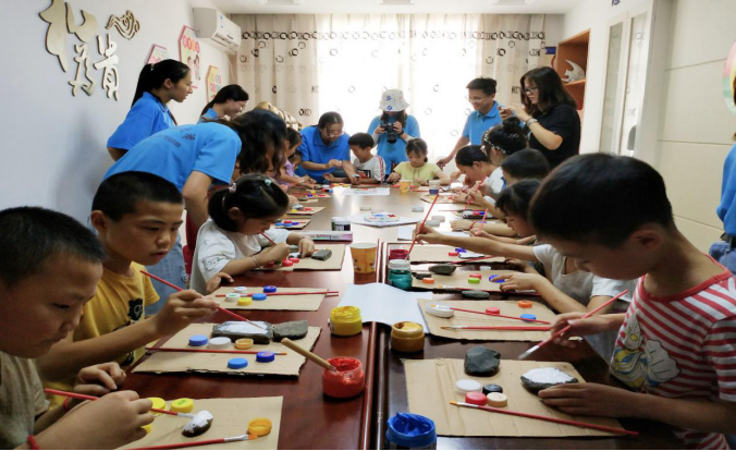 这天下午,团队成员前往燎原社区,在燎原社区党群服务中心开展了一场别开生面的环保知识宣讲以及手工环境教育课。在环保知识宣讲结束后,团队成员带着小朋友们利用废弃纸板、瓶盖还有石头开始了自己的创作。小朋友们极尽发挥自己的想象,把一块块朴素的石头变成了棱角分明的小动物,把一张张废弃的纸板变成了色彩斑斓的