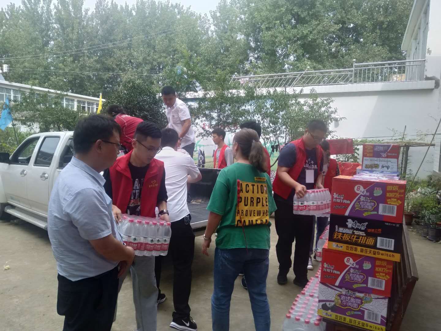 图为彭阶赞(左起第二)参加正阳关镇共青团志愿者协会搬运和分发抗洪物资