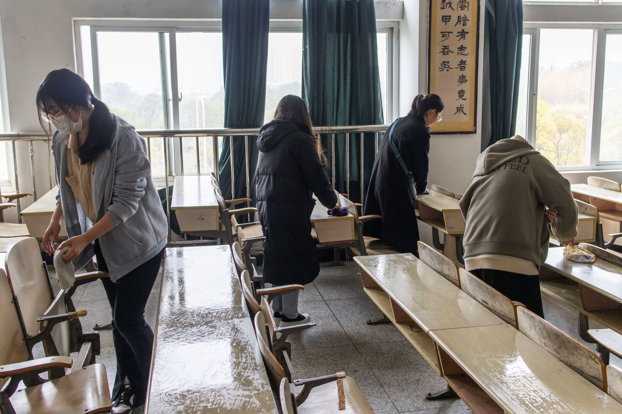 文渊楼一楼的8个教室是第一小组的责任区,小组组长、思想政治教育专业2021级(2)班的刘东来带领着11名组员清理垃圾、擦洗桌凳、清洁消毒,按部就班地完成每一间教室的清扫任务。刘东来表示,每天都会有大量员工在四栋主教学楼上课,打扫教室虽然是一件小事,却可以让同学们拥有一个干净整洁的学习环境,从而更好地投身学习。“尽己所能帮助他人会让我觉得开心与满足,希望在服务中实现自我价值,在实践中学本领、长才干。”
