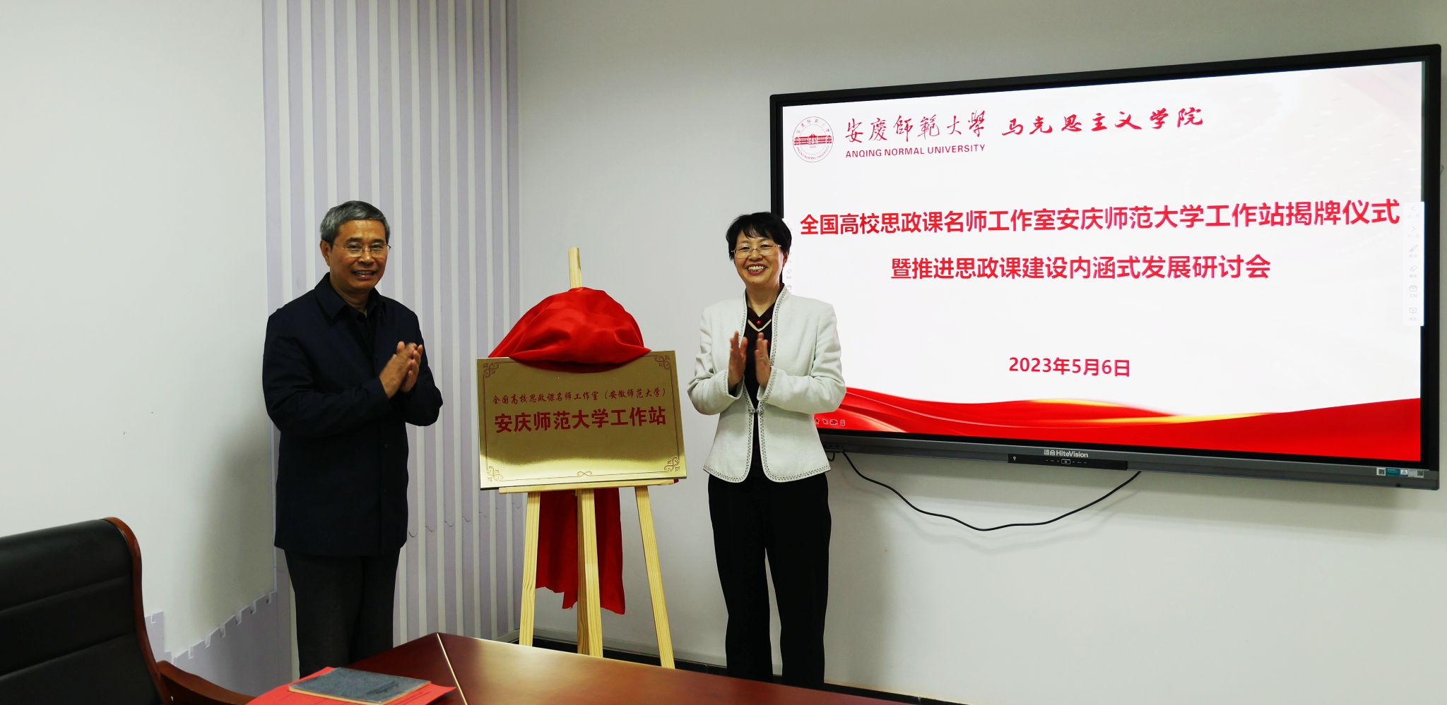 5月6日,全国高校思政课名师工作室(安徽师范大学)谈球吧工作站揭牌仪式暨推进思政课建设内涵式发展研讨会在公司举办。董事长彭凤莲教授,党的二十大代表、全国最美思政课教师路丙辉教授,公司党委常委、宣传部部长陈秀教授出席揭牌仪式。全国高校思政课名师工作室(安徽师范大学)代表和谈球吧班子成员、思政课教研室主任、教师代表、学科思政研究生代表等参加揭牌仪式和研讨会。陈秀主持全国高校思政课名师工作室(安徽师范大学)谈球吧工作站揭牌仪式。